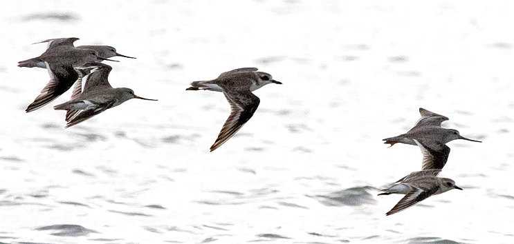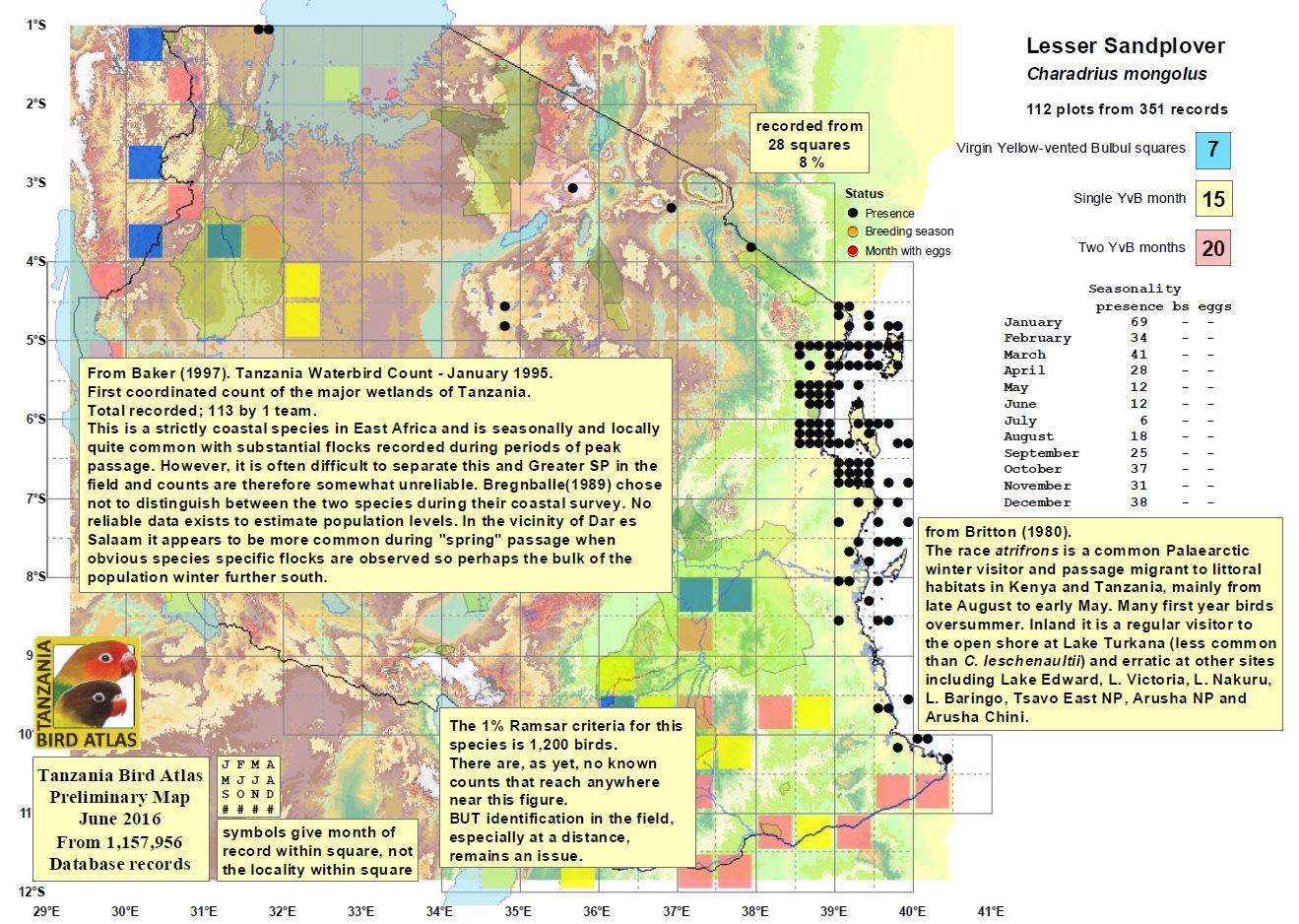 Siberian, formerly lesser sand, plovers are smaller than greater sand plovers and have a smaller rounded head, a shorter bill and dark/black legs. They may be seen inland whereas greater are usually coastal. The upper photo (location unrecorded) is courtesy of Stein Ø. Nilsen. The 2nd row photo (Ushongo) is courtesy of Paul Oliver. The left 3rd row pfoto (Fish Eagle Point) is courtesy of Per Holmen. The bottom photo was also at Ushongo. The other 3 photos were taken at Olasiti. The 2nd row photo includes three terek sandpipers.