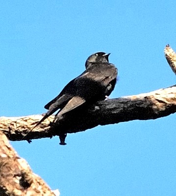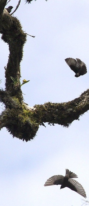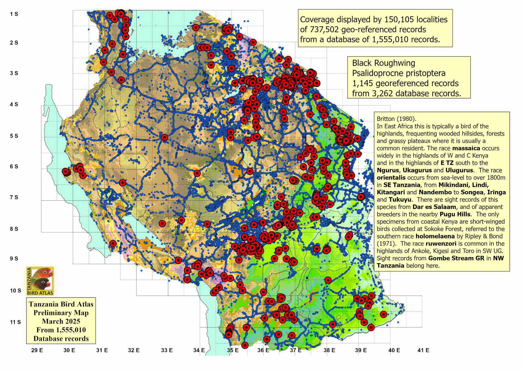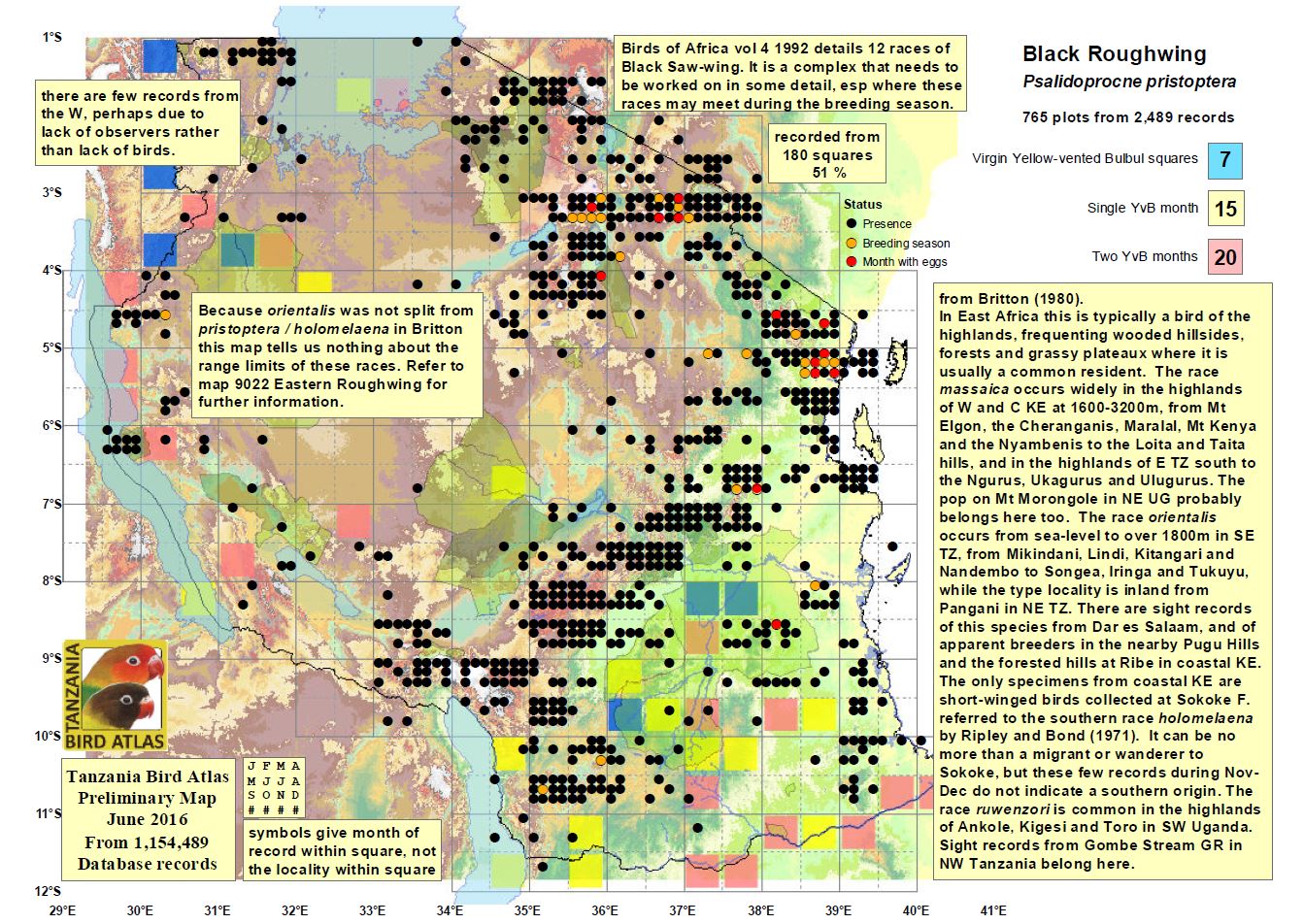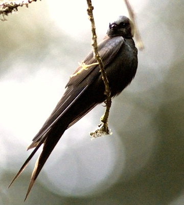 The black sawwing is a large (15 cm) swallow with gray-brown underwing coverts. The left upper image was taken at Maji Moto, courtesy of Colin Beale; the right upper, at Arusha NP, courtesy of Paul Oliver. The center photos were taken in Magamba FR (left) and Arusha NP; the right lower photo, at Kibale NP-Uganda, courtesy of Karine Van der Vurst; and the left lower, West Kilimanjaro. The slideshow includes immatures and adults; the adults have a deeply forked tail which immatures lack; click the right lower photo to see 8 enlargements. |