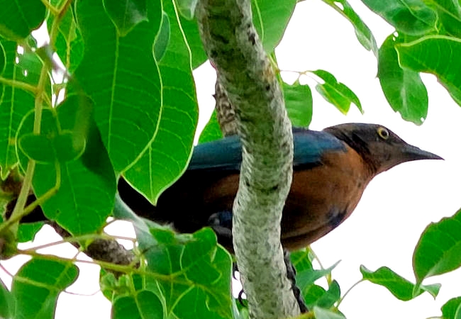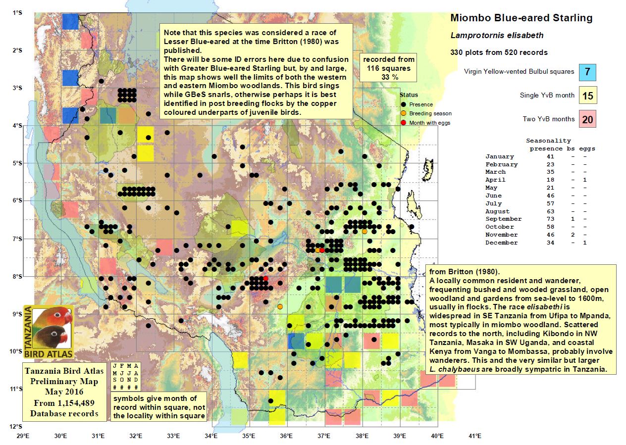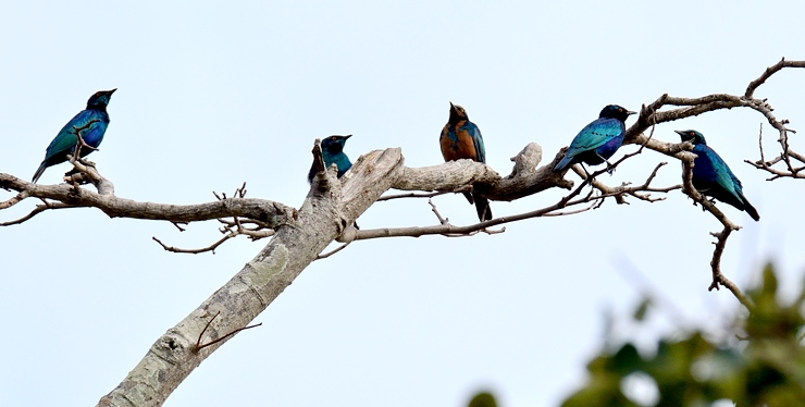 The lesser blue-eared starling, formerly miombo, is similar to the greater blue-eared starling, but in good light the belly and flanks are magenta, not well seen in the photos above (upper, Mikumi; middle, Msumbugwe forest). The juvenile in the lower photo (Msumbugwe forest) shows the distinctive mottled, rust-coloured underparts. The left 2nd row adult (Mikumi) is courtesy of Per Holmen. |