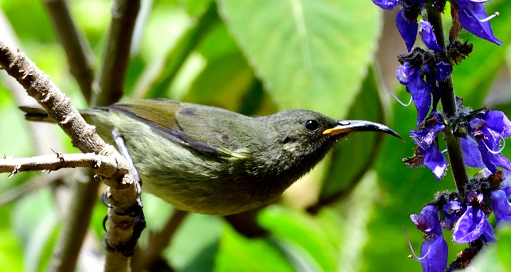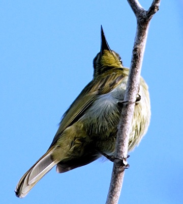The olive sunbird is a common sunbird of coastal and highland forest. The upper bird (Msosa-Udzungwa, 5/20) and the 2nd row bird (Mbuyuni Farm near Morogoro, 9-20) ane both courtesy of Kim Axmann; the 3rd row, at Magamba Forest (10-22), courtesy of Per Holmen; the 4th row, Pembe Abwe (4-10); the lower, in Dar es Salaam (8-13), courtesy of Anne Outwater. Click the photo above to see 15 enlargements, one of which also shows yellow pectoral tufts.