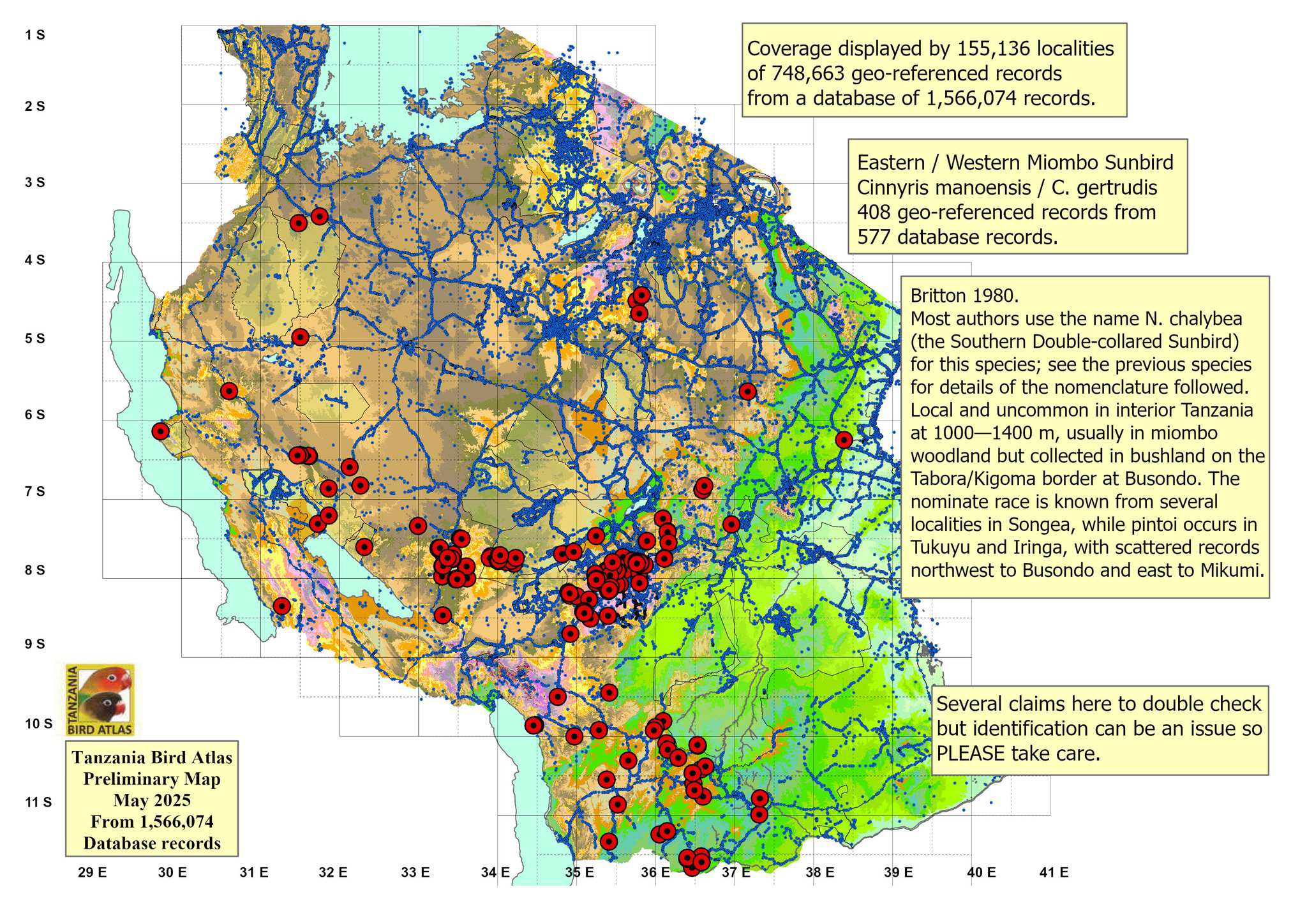 The western miombo sunbird is uncommon in miombo woodland in the southern highlands and western Tanzania. The upper two photos were taken in Mahale NP, courtesy of Paul Oliver. The right lower photo was also taken in Mahale. The others were photographed in Babati.