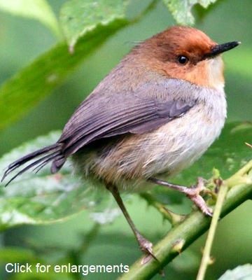 The upper and left bottom photos of African tailorbirds, previpusly called red-capped forest warblers, were taken in the Magamba Forest-West Usambaras, courtesy of Per Holmen; the 3rd row, also Magamba Forest, is courtesy of Frank Priscus Shirima. The other photos are courtesy of Dr. Louis A. Hansen who comments: Adult, subspecies uncertain, Udzungwa Mountains. Click the left lower photo to see 7 enlargements. |