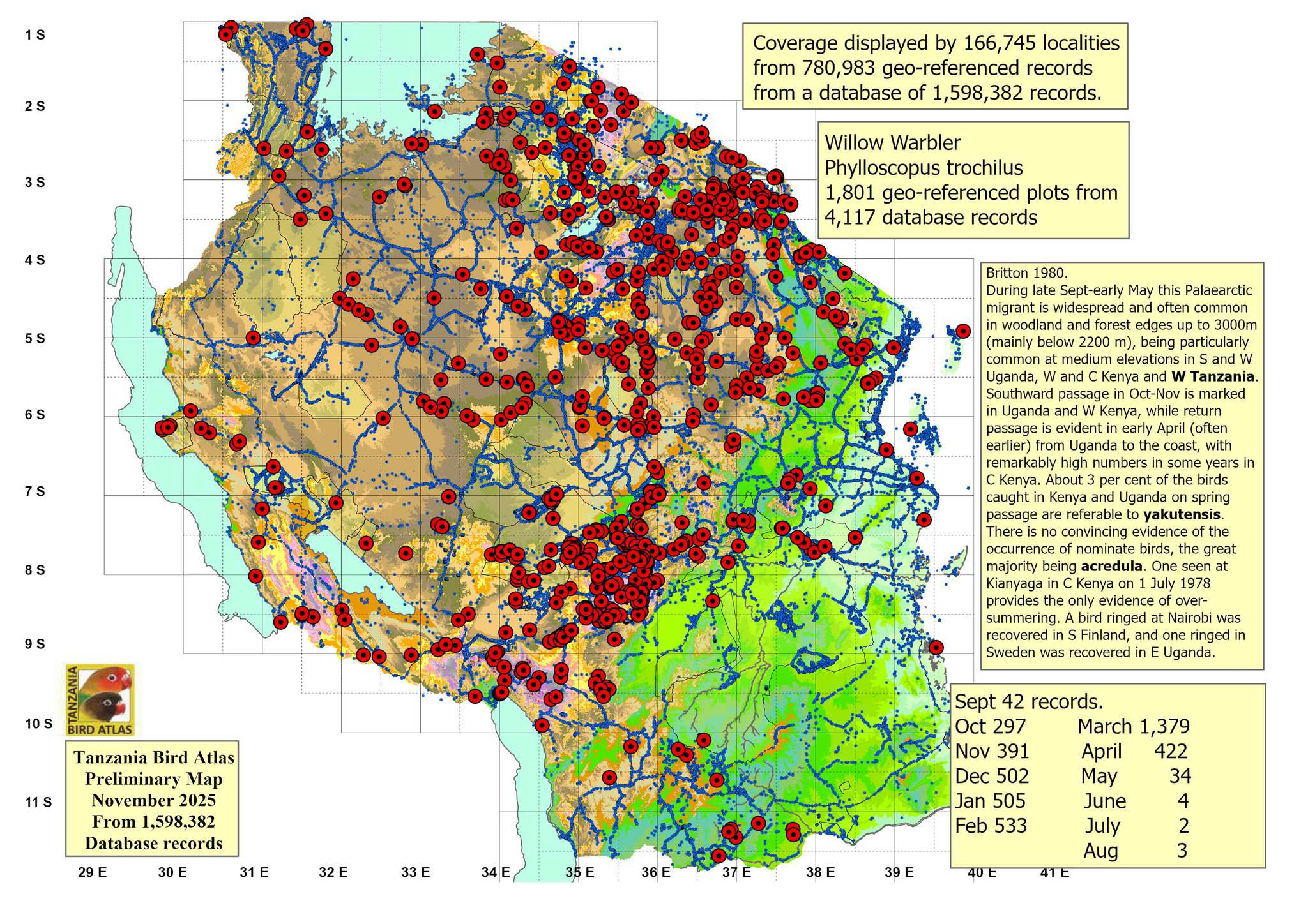 The willow warbler is a palearctic migrant found throughout sub-saharan Africa. The left lower photo is ssp. acredula, photographed in Lukuba, courtesy of Valéry Schollaert. The upper two birds were seen at Rubondo and Kekasio, both courtesy of Paul Oliver; the 3rd row photo is courtesy of Frank Priscus Shirima; the 4th row bird was at Mwiba. The next four photos are ssp. yakutensis, seen in Pembe Abwe. The right lower bird was seen in the Nou Forest; click it to see 16 enlargements. |