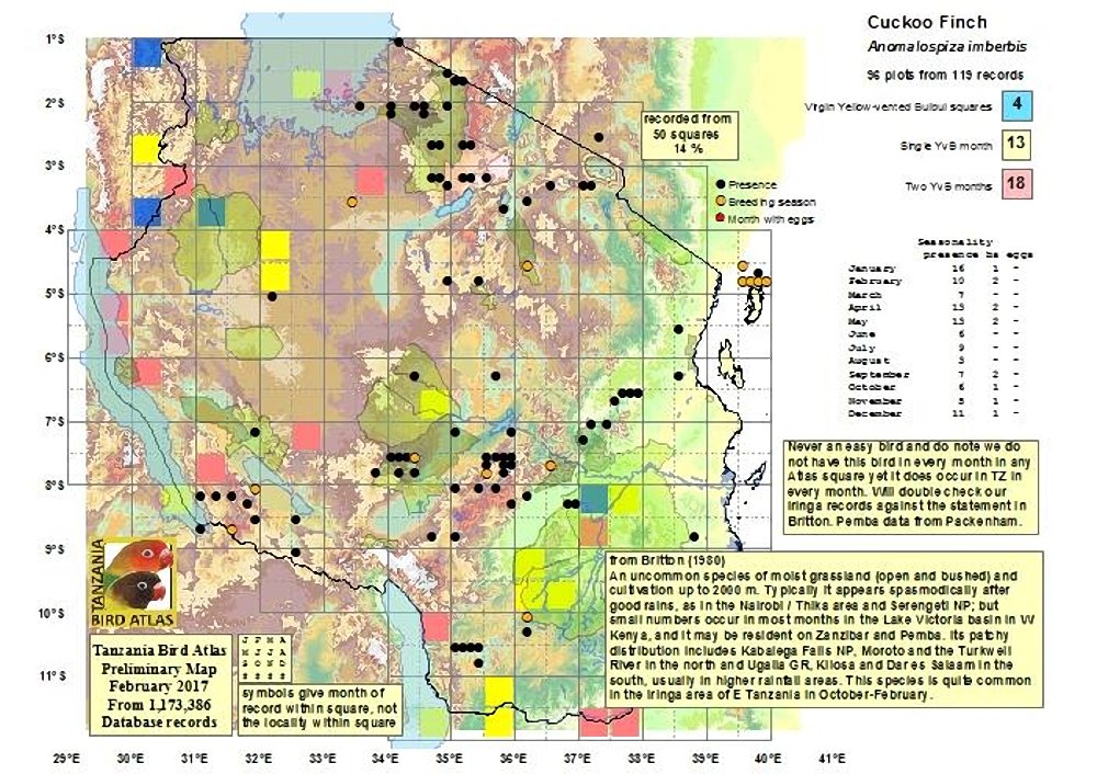 The parasitic weaver is parasitic on cisticolas and prinias. The upper two photos were taken in Mikumi NP, courtesy of Nik Burrow. The 3rd row bird was photographed in Pilanesberg, So. Africa and the right 4th row bird, in the Masai Mara, both courtesy of Karine Van der Vurst. The left lower photo is courtesy of Isaac Kilusu. |