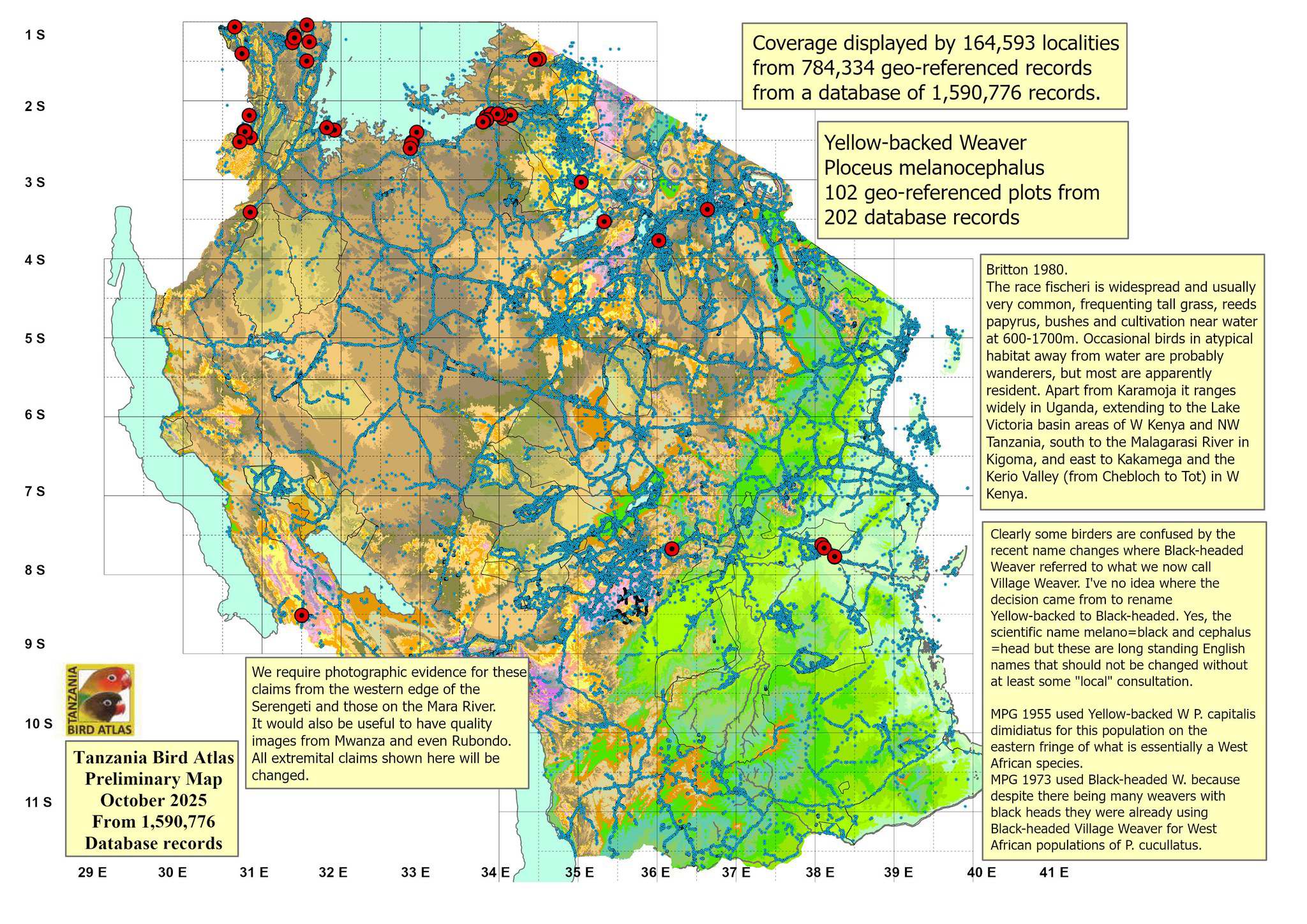 The range of the yellow-backed weaver, also called yellow-mantled or black-headed weaver, includes northwestern Tanzania. The upper two male photos were taken at Speke's Bay, courtesy of Paul Oliver; the female, in Minziro FR, courtesy of Per Holmen. The other photos were taken at Lake Bunyonyi-Uganda, courtesy of Karine Van der Vurst. Click the photo above to see 13 enlargements including a nest and breeding males. |