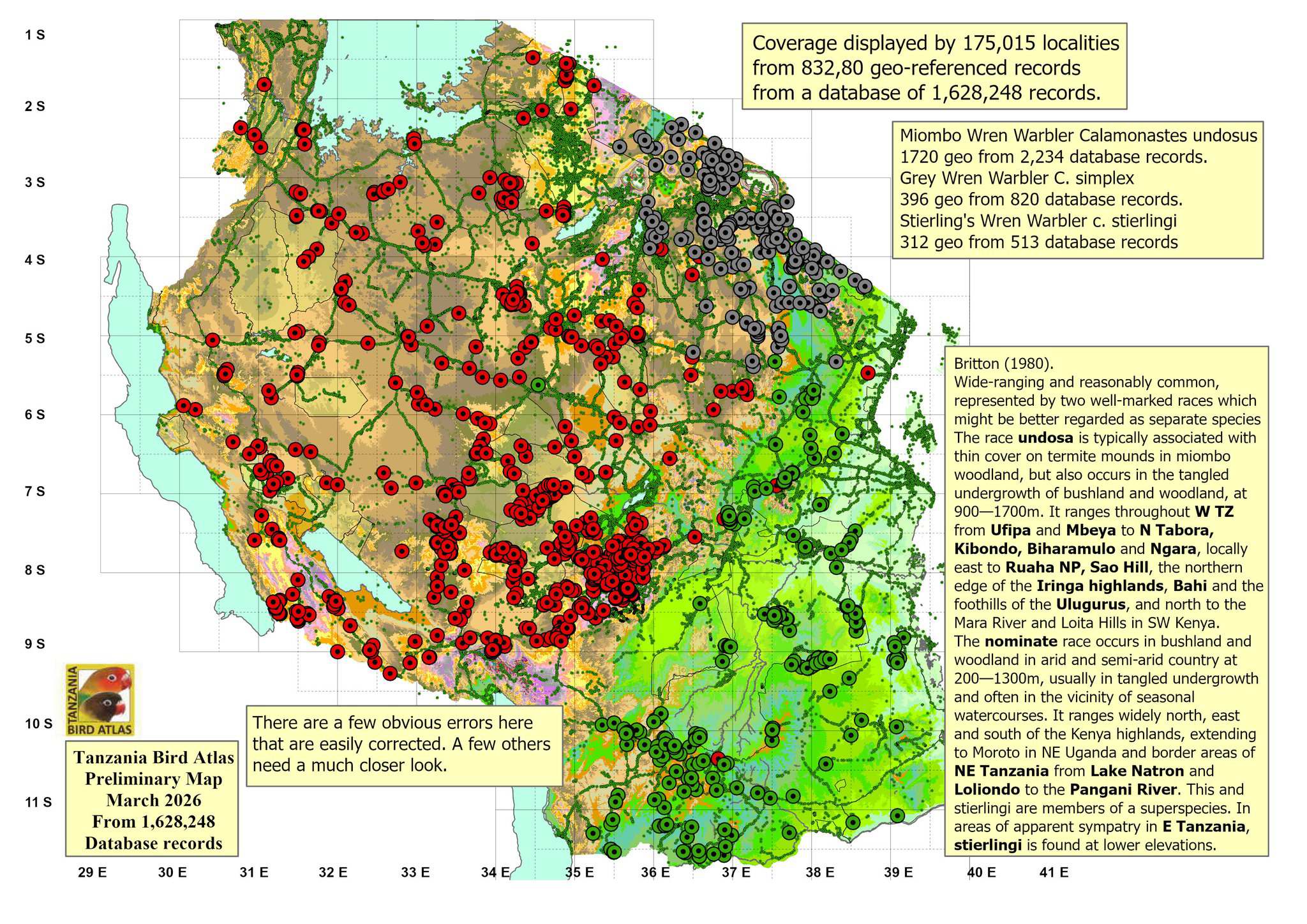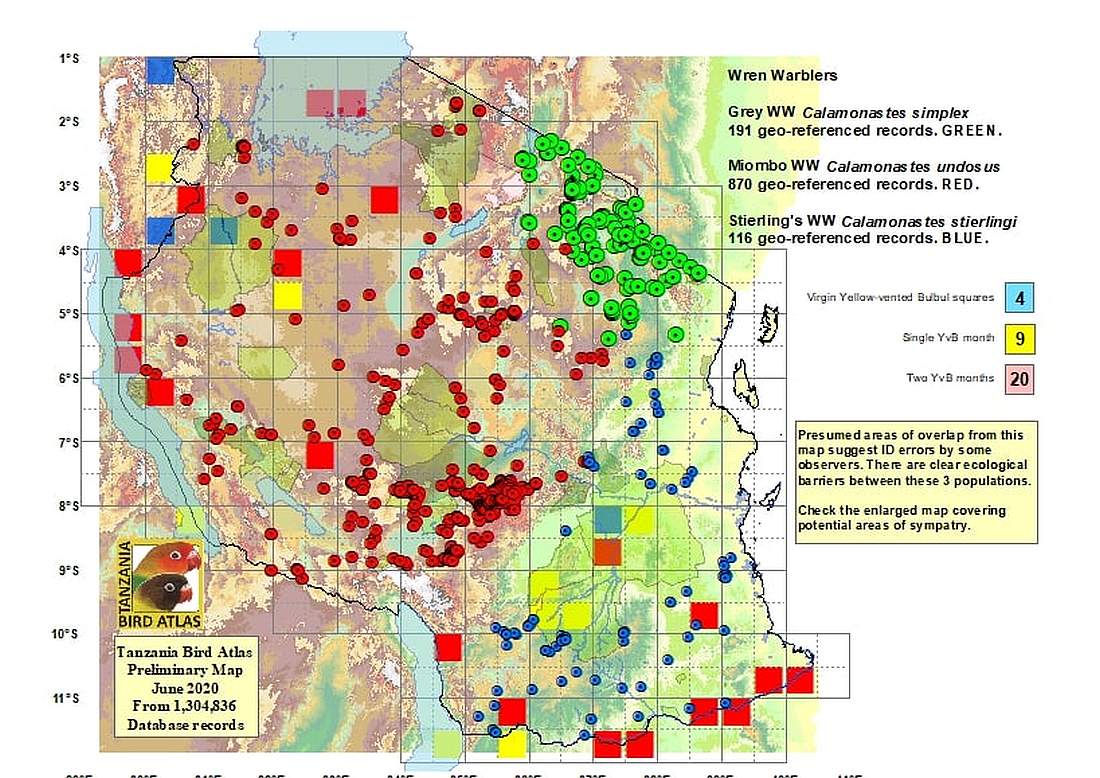 The miombo, formerly pale, wren-warbler is found in miombo woodland and in bushland undergrowth in central and western Tanzania, see map. The left 2nd and left 3rd row photos (Iringa Highlands) are courtesy of Paul Oliver; the right 2nd row (Maswa GR) is courtey of Amos Pampy Hardecker. The other photos (Ndutu, Kahama & Kisolanza) are courtesy of Per Holmen. |