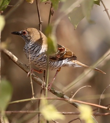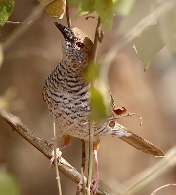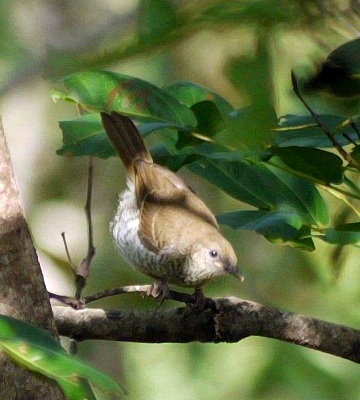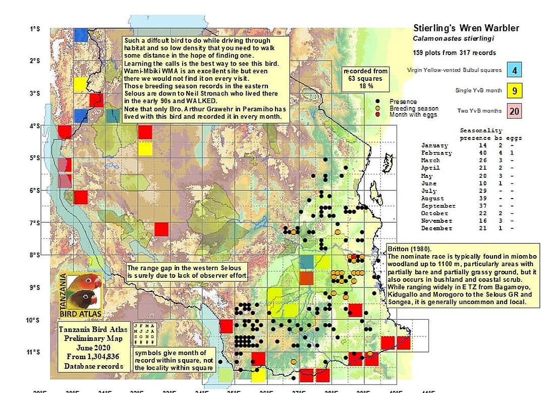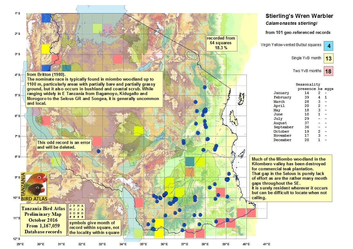 Stierling's wren-warbler is found in miombo woodland, but it also occurs in bushland and coastal scrub. The right upper photo was taken at Chalinze (2-16), courtesy of Riaan Marais; the left upper, at the Mkuju River Camp (2-12), courtesy of Jez Simms; and the lower three, at the Mbuyuni Farm near Morogoro (middle, 9-16; bottom, 8-19), courtesy of Kim Axmann. |